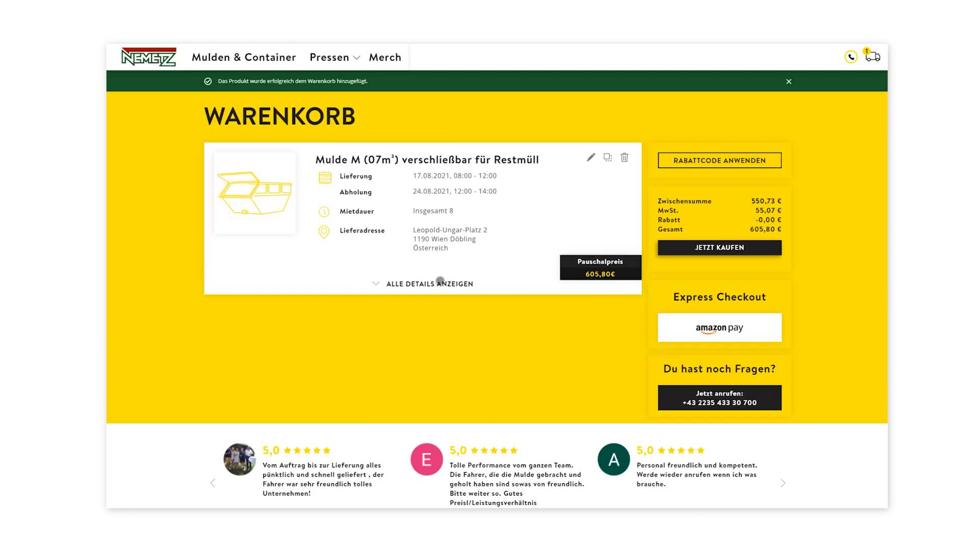 Für die Nemetz AG wurde ein Onlineshop und eine Plattform für B2B Kunden erschaffen. Der gesamte Entsorgungsprozess wurde digitalisiert (B2C) und für Partnerfirmen ist es mit der Plattform schnell & einfach möglich einen eigenen Webshop zu erstellen.