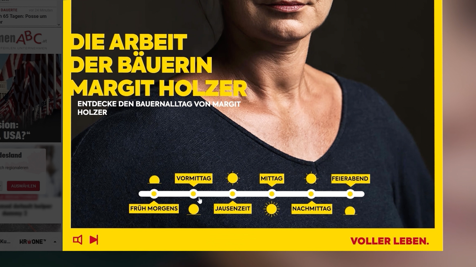 Je nach Uhrzeit wurde dem User das zur Tageszeit passende Video angezeigt. So ging es beispielsweise frühmorgens aufs Feld, zu Mittag in die Scheune und am Abend zur Ernte. Wollte der User mehr über den Tag erfahren, konnte er über einen Regler in der Sitebar zu anderen Tagesabschnitten springen.