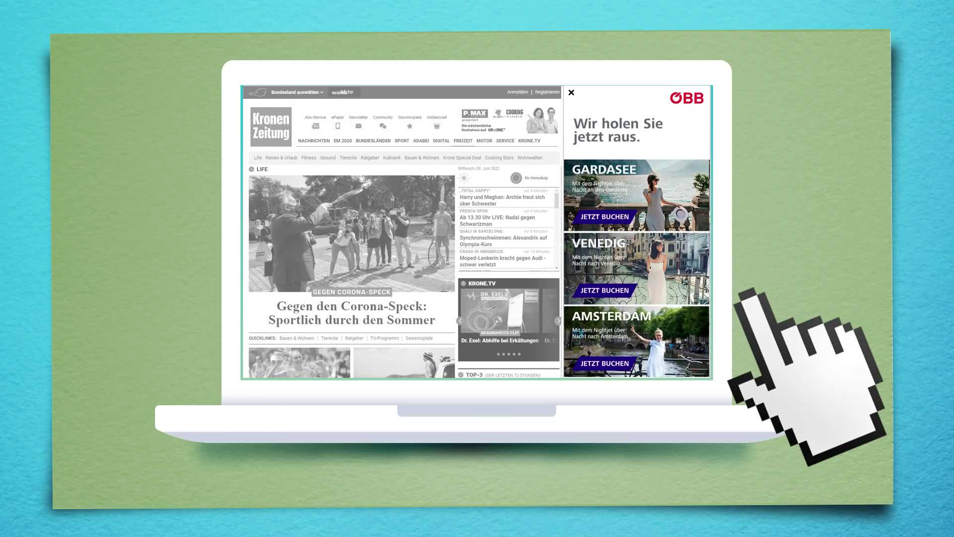 Die Bedürfnisse und Wünsche der einzelnen UserInnen auch innerhalb einer Werbe-Zielgruppe sind sehr unterschiedlich. Die gesamte Gruppe mit nur einem Werbemittel anzusprechen und zu erreichen, ist nicht effizient und effektiv. Folglich haben wir ein Werbemittel entwickelt, dass den UserInnen freie Wahl lässt, welche näheren Informationen sie zu den ÖBB-Reisedestinationen erhalten möchten.