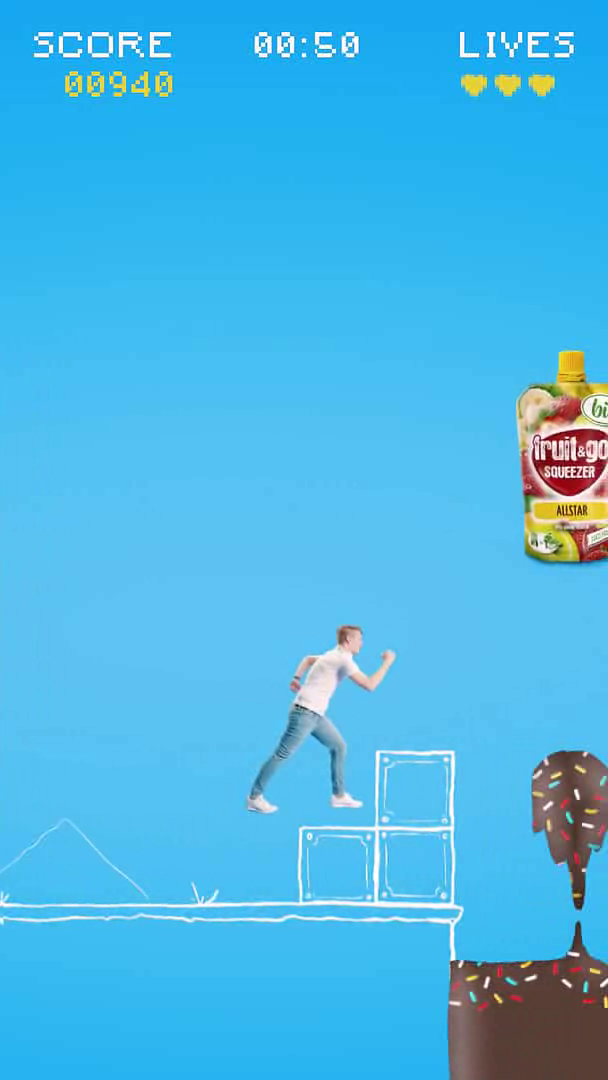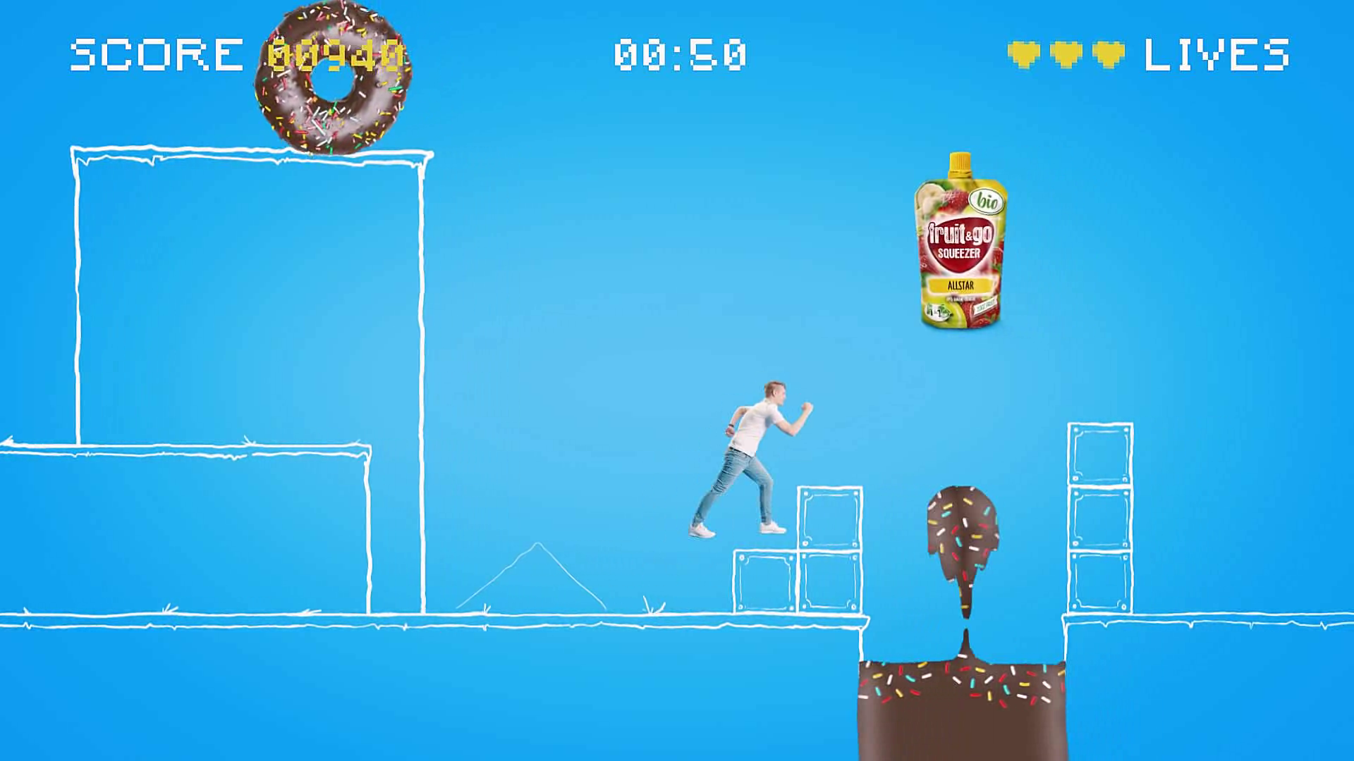 Die Video-Ads ziehen durch den Retro-Game-Stil sofort die Aufmerksamkeit der Zielgruppe auf sich. Im angedeuteten Jump'n'Run weicht die Spielfigur (dargestellt von Philipp Gutmann) ungesunden Snacks wie Donuts und Schokolade aus und sammelt Obst. Der volle Squeezer Kick führt zum "Power-Mode" (ähnlich wie der Stern bei Super Mario).