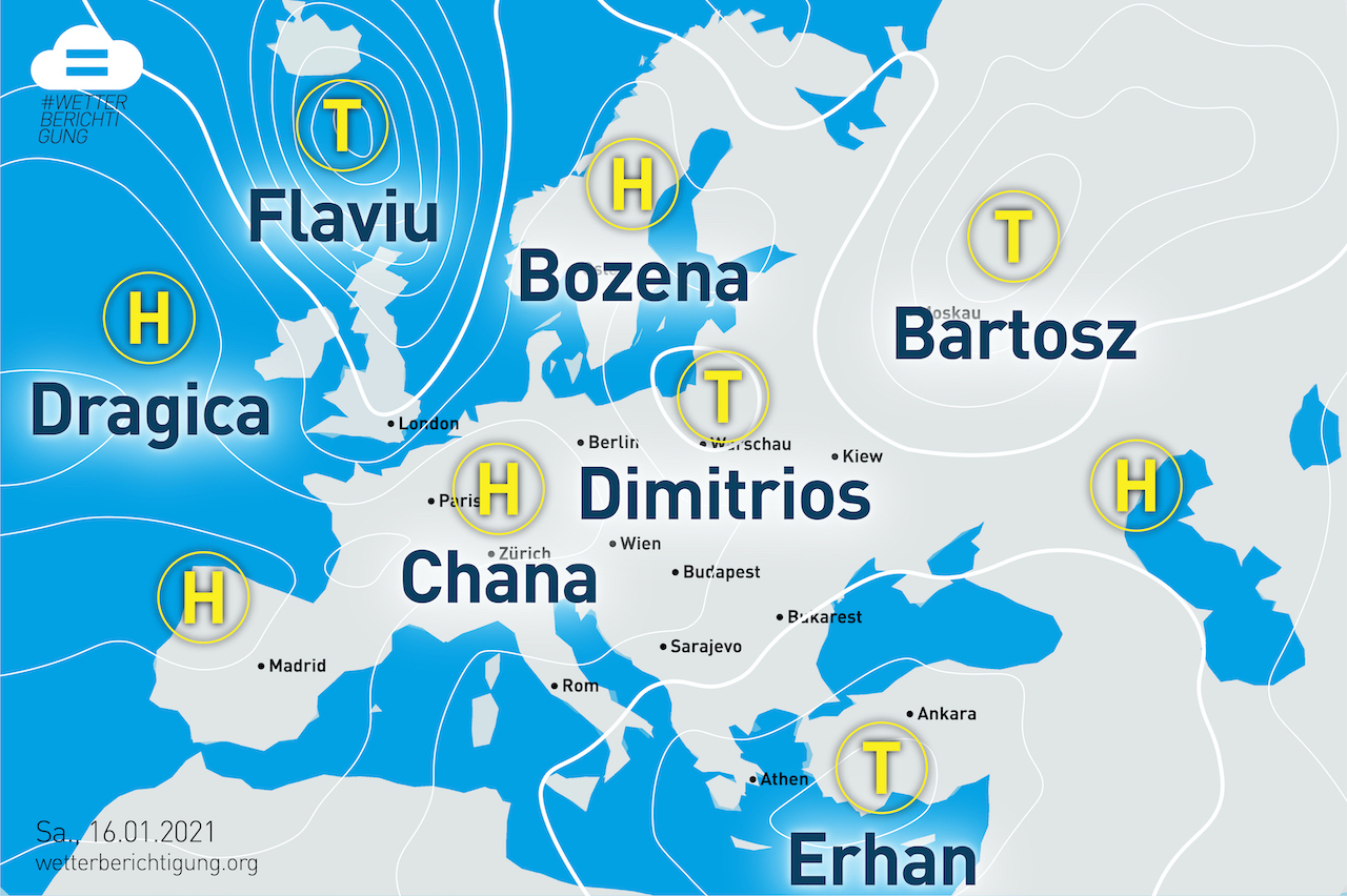 Jeder in Deutschland kann Patenschaften für Hoch- und Tiefdruckgebieten übernehmen. Wir kauften die ersten 13 des Jahres 2021 und gaben ihnen statt Thomas oder Katharina typisch migrantische Namen wie Ahmet und Dragica.